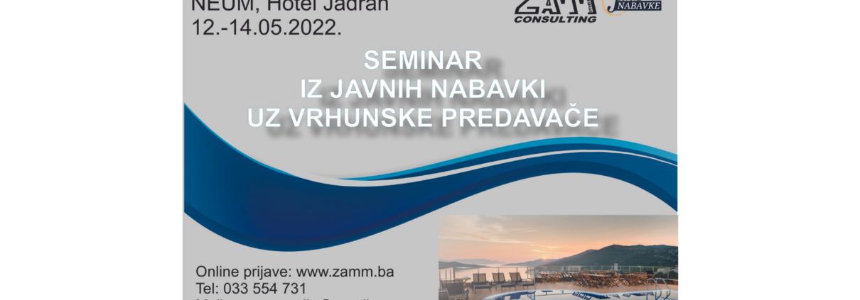 /in Aktuelno, BiH, Biznis Vijesti, Seminari i Edukacije /by Azra IslamagićTrodnevni seminar Javne nabavke praksi bit će održan od 12. – 14. maja 2022. godine u hotelu “Jadran” u Neumu.